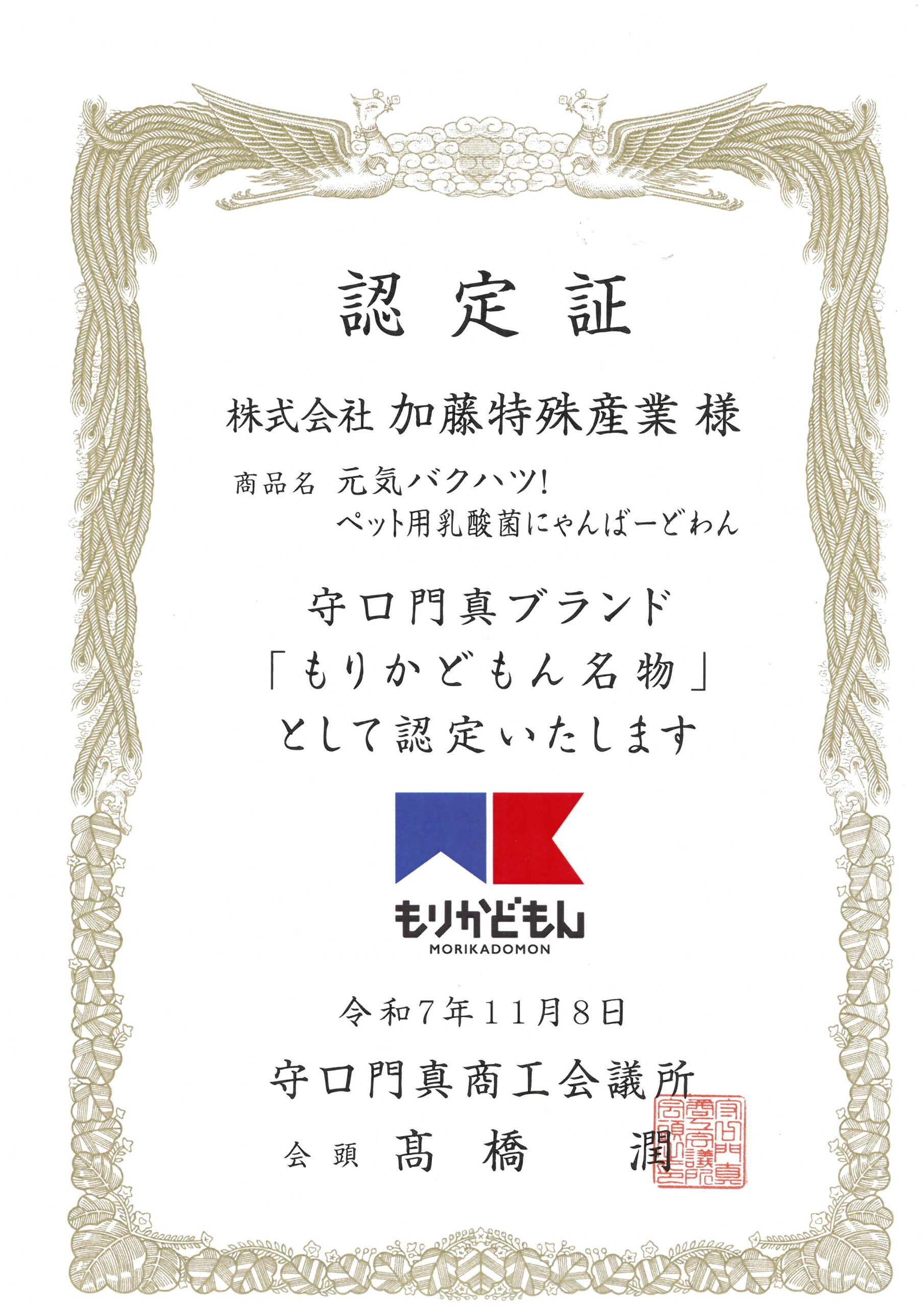 にゃんばーどわんが守口門真ブランド「もりかどもん」に認定されました。